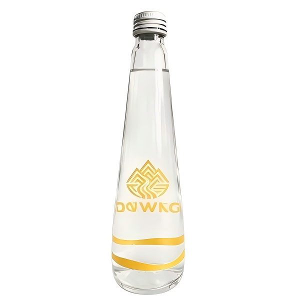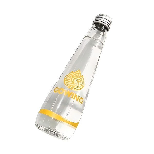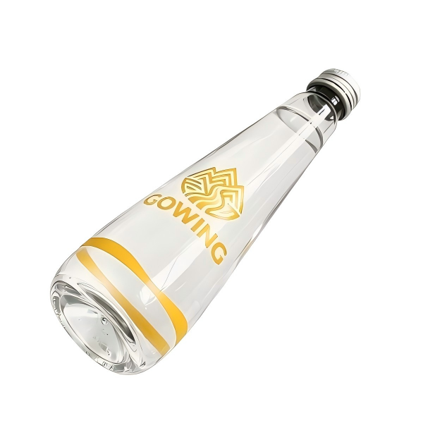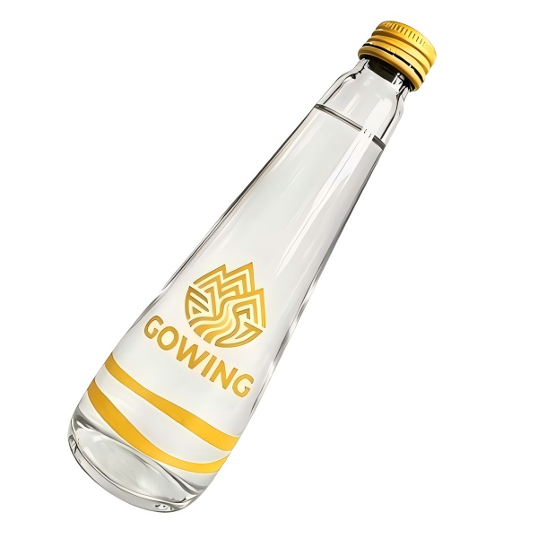 ●Custom 380ml glass water bottle with gold-stamped logo and leak-proof cap, perfect for bulk orders, brand promotion, hotels and events.